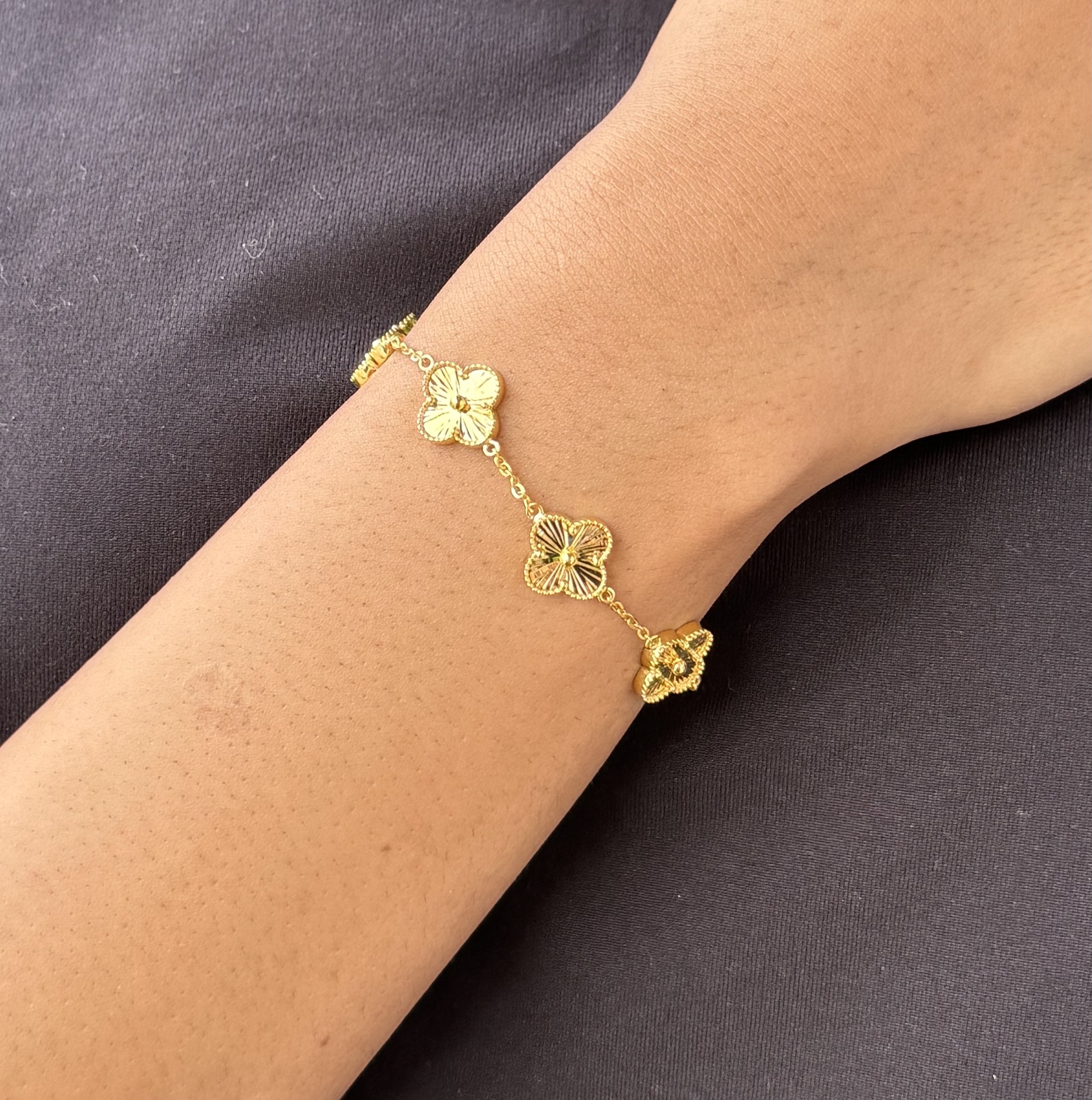 Clover mini bracelets Gold — crafted from high-quality stainless steel with luxurious 18k gold plating. Designed to be anti-tarnish, waterproof, and hypoallergenic, making it perfect for comfortable, long-lasting wear.