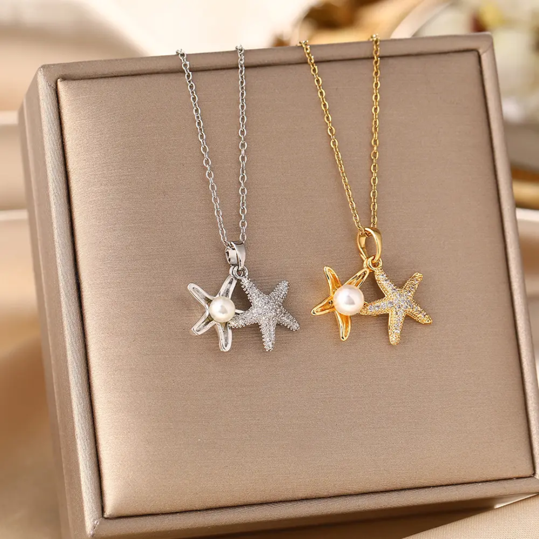 Pearl Star necklace — crafted from high-quality stainless steel with luxurious 18k gold plating. Designed to be anti-tarnish, waterproof, and hypoallergenic, making it perfect for comfortable, long-lasting wear.