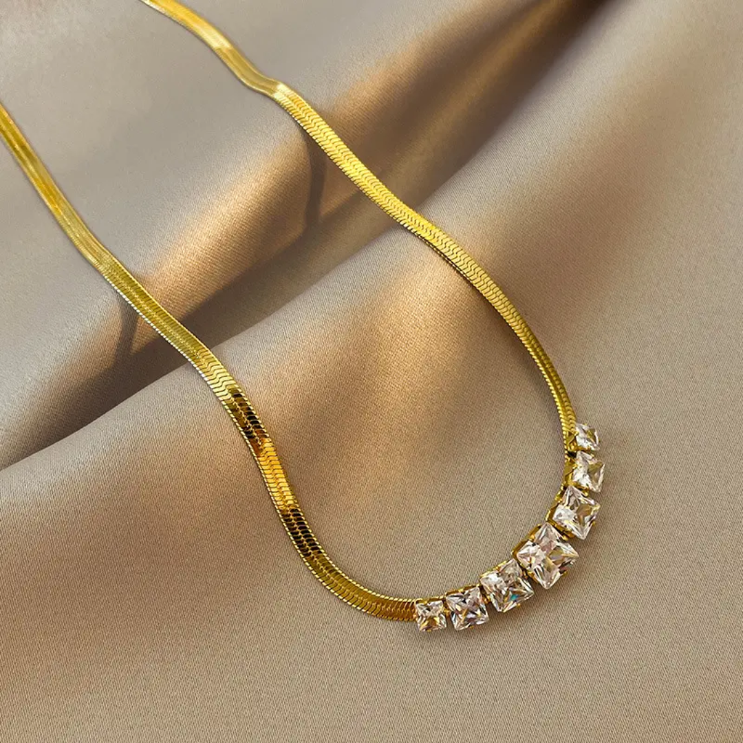 premium white sequence diamond necklace — crafted from high-quality stainless steel with luxurious 18k gold plating. Designed to be anti-tarnish, waterproof, and hypoallergenic, making it perfect for comfortable, long-lasting wear.