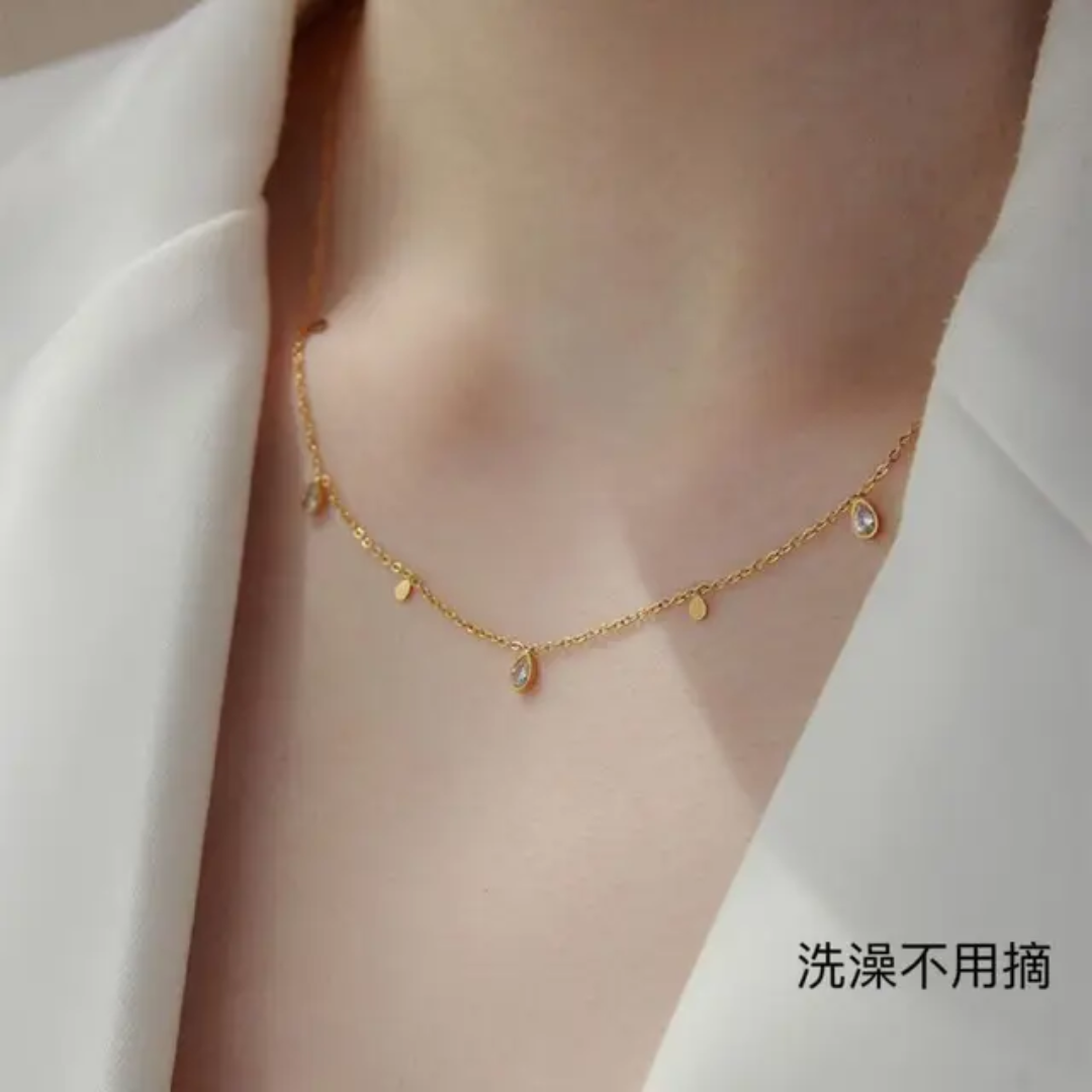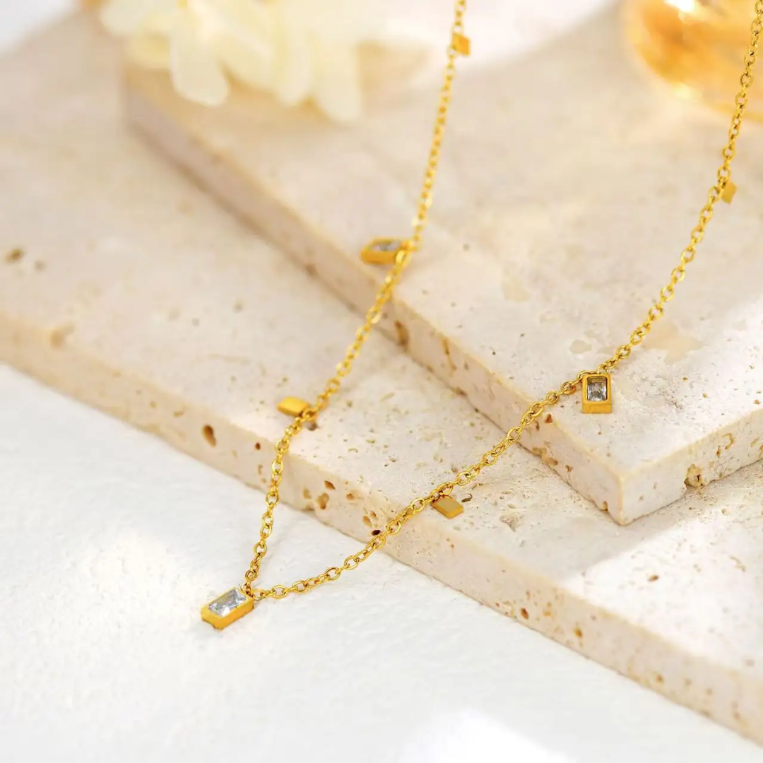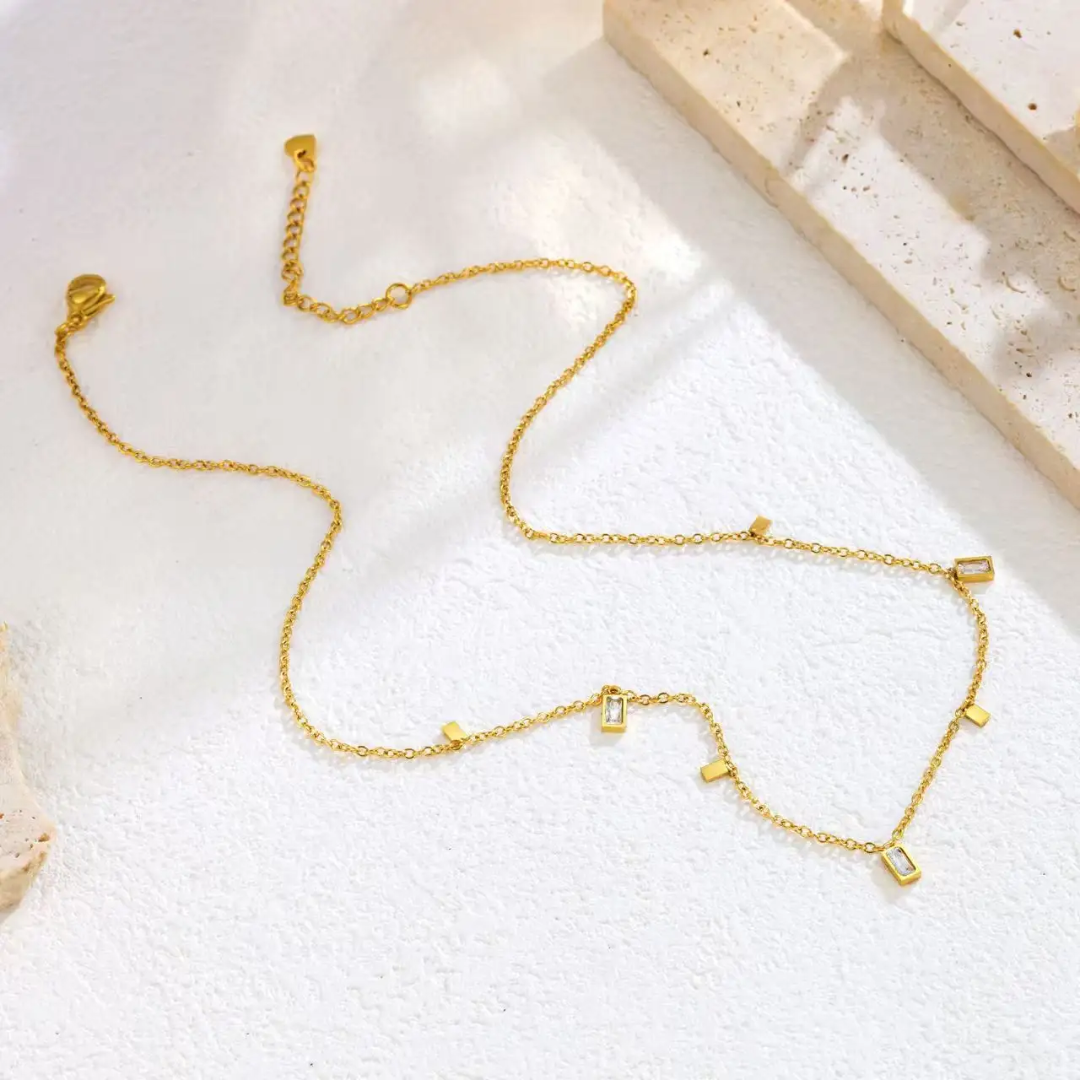 Tassel white rectangle diamond necklace — crafted from high-quality stainless steel with luxurious 18k gold plating. Designed to be anti-tarnish, waterproof, and hypoallergenic, making it perfect for comfortable, long-lasting wear.